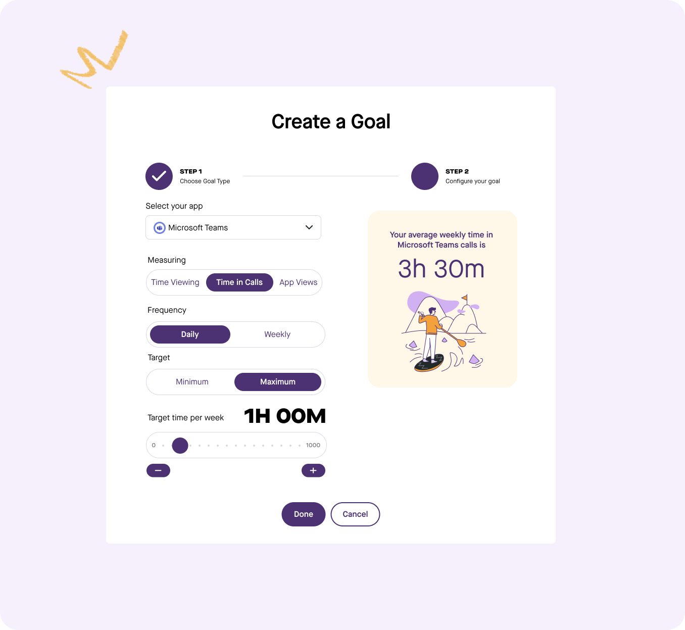 Produce8 enables individuals to set specific goals and shows them the desired outcomes if they decrease their time spent in Microsoft Teams calls and reallocate it to meaningful work applications.