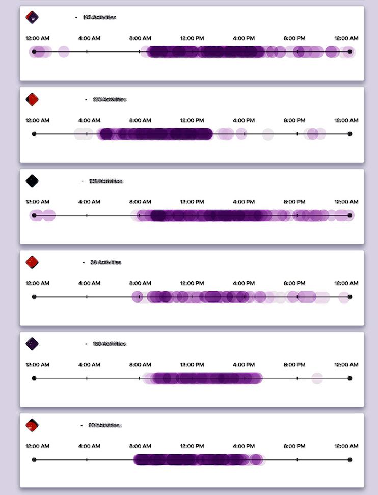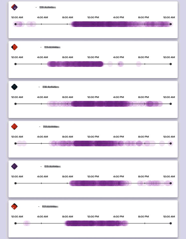 Here’s a glimpse at what two weeks of Slack usage data looked like for some of our team members. Each purple dot represents a separate Slack interaction, and we’ve layered them on top of one another to show the highest usage periods throughout the day.