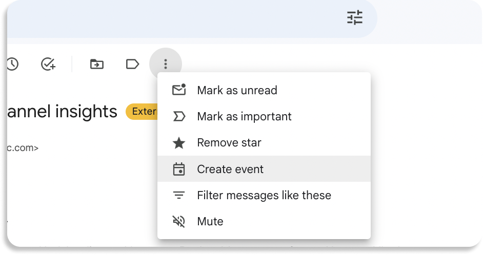 In Gmail, open the email and click on the three-dot menu at the top right corner. Next, select “Create event” to open Google Calendar, where you can set a specific time block for responding to the email.