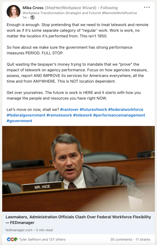The goal was to modernize federal telework using lessons learned during the pandemic. And according to Senator James Lankford, before that it had “been a decade since the last significant piece of telework legislation, the Telework Enhancement Act of 2010.”