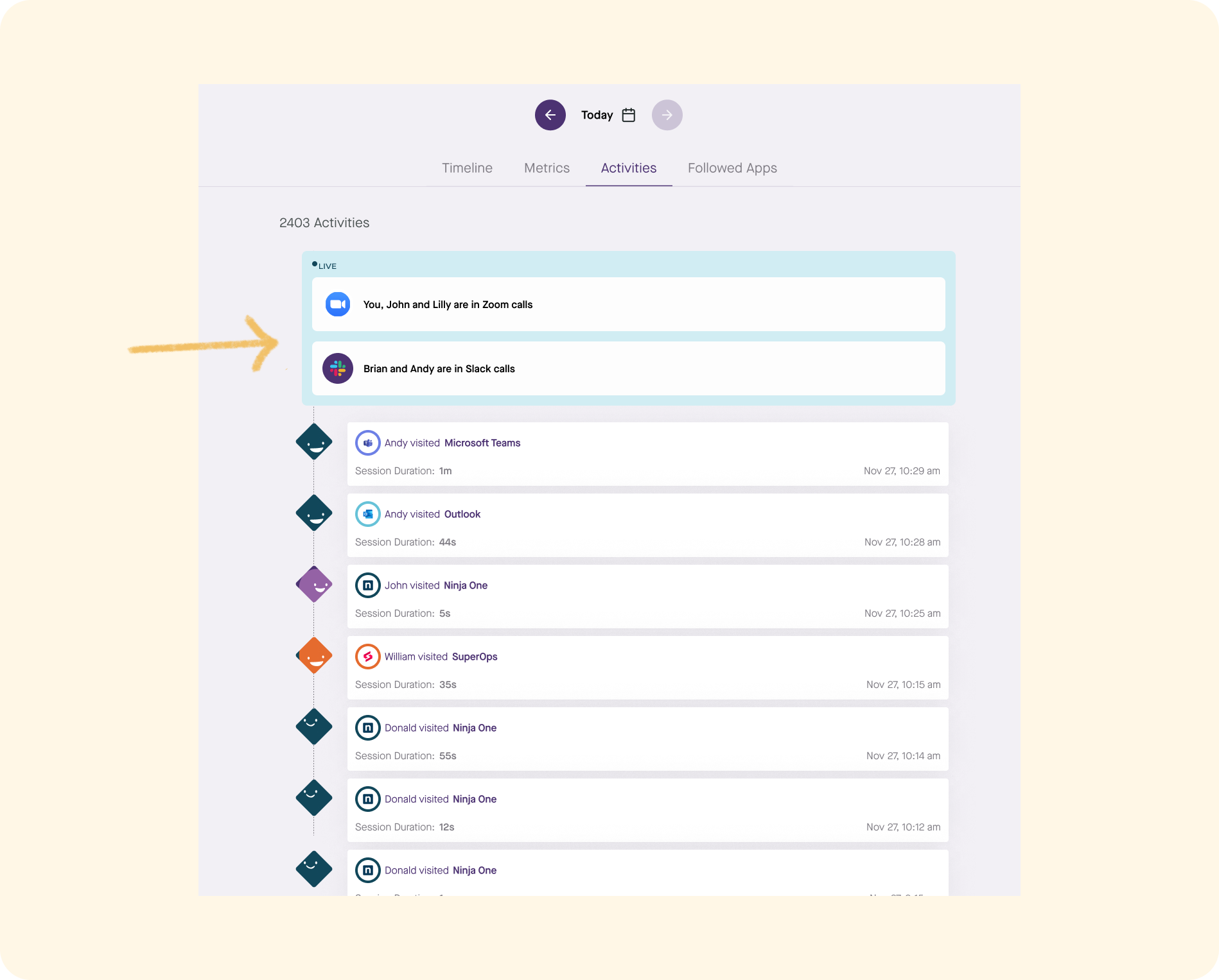 On your Timeline, you'll notice two swim lanes: Views and Calls. When these lanes overlap, it indicates that you're engaging with other tools while on a call. Whether you're screen sharing, presenting, or simply multitasking with other work tools during a meeting, you'll now have visibility into your activities.