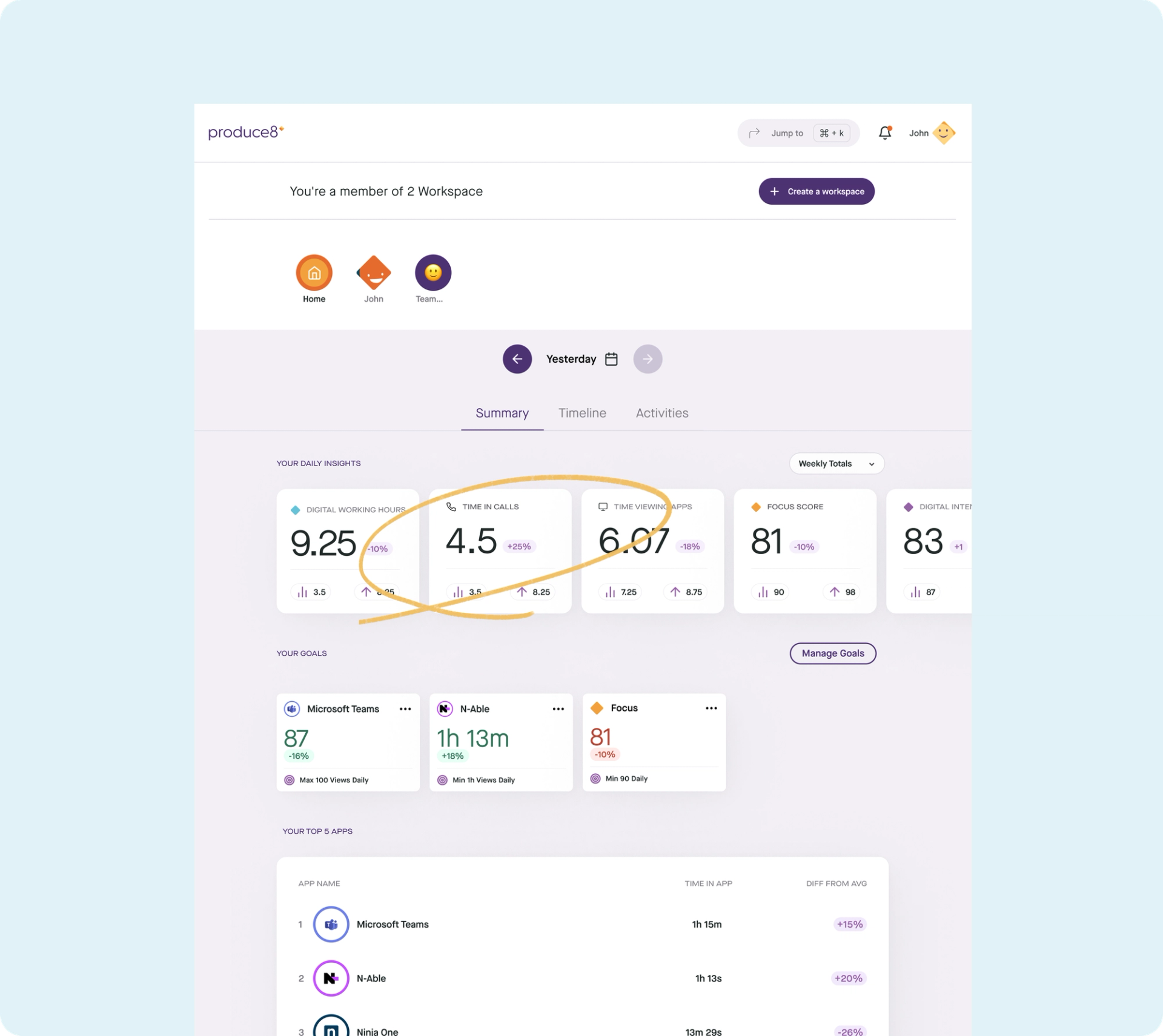 Calls consume a significant amount of time during the workday. By gaining insights into the virtual meeting habits of yourself and your team, you can take steps to regain control of your schedule. Don't let meetings, calls, and huddles consume your time and energy anymore — see what’s working and what isn’t with Produce8’s Call!