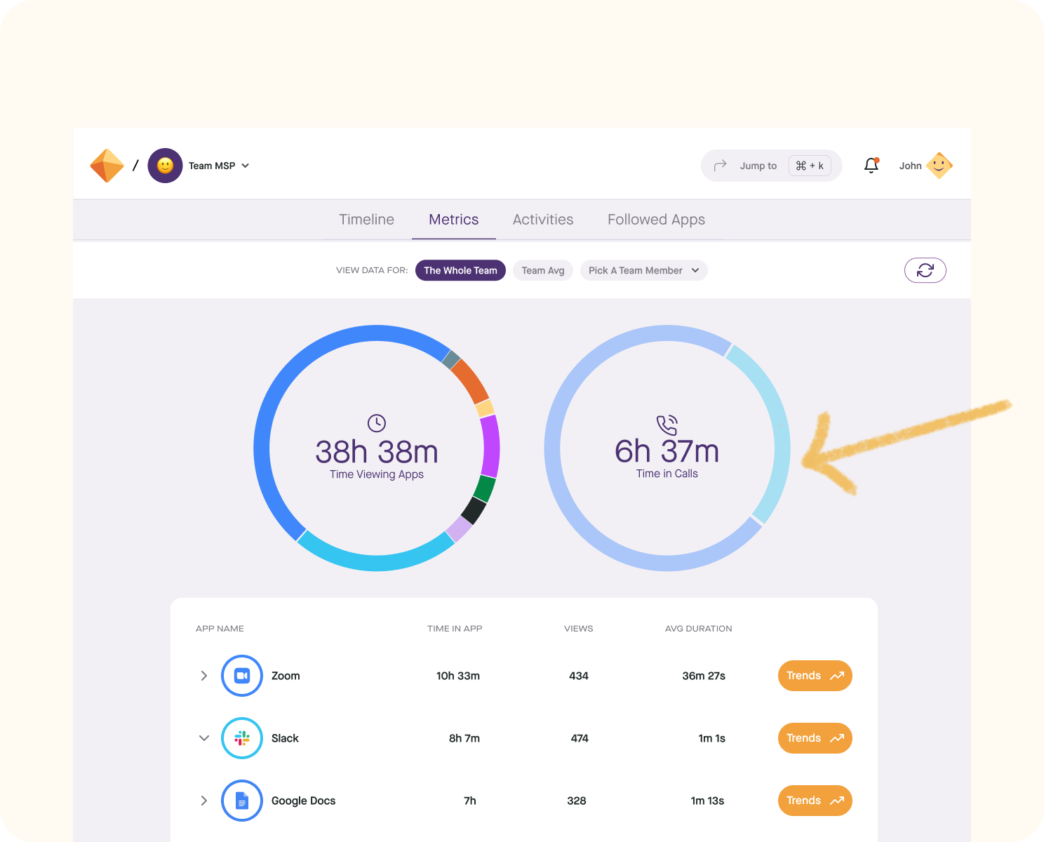 This addition allows us to distinguish between your App Views (having an app in focus on your device) and Calls (participating in a virtual call), allowing you to gain a deeper understanding of your time allocation and tool engagement patterns.