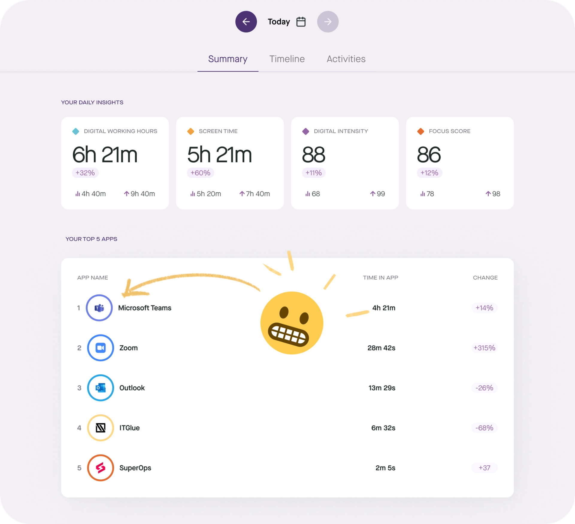 In Produce8, you can easily see your Digital Working Hours, Time In Apps, and Digital Intensity Scores. This data gives you a good idea of how long you spend at your desk working.