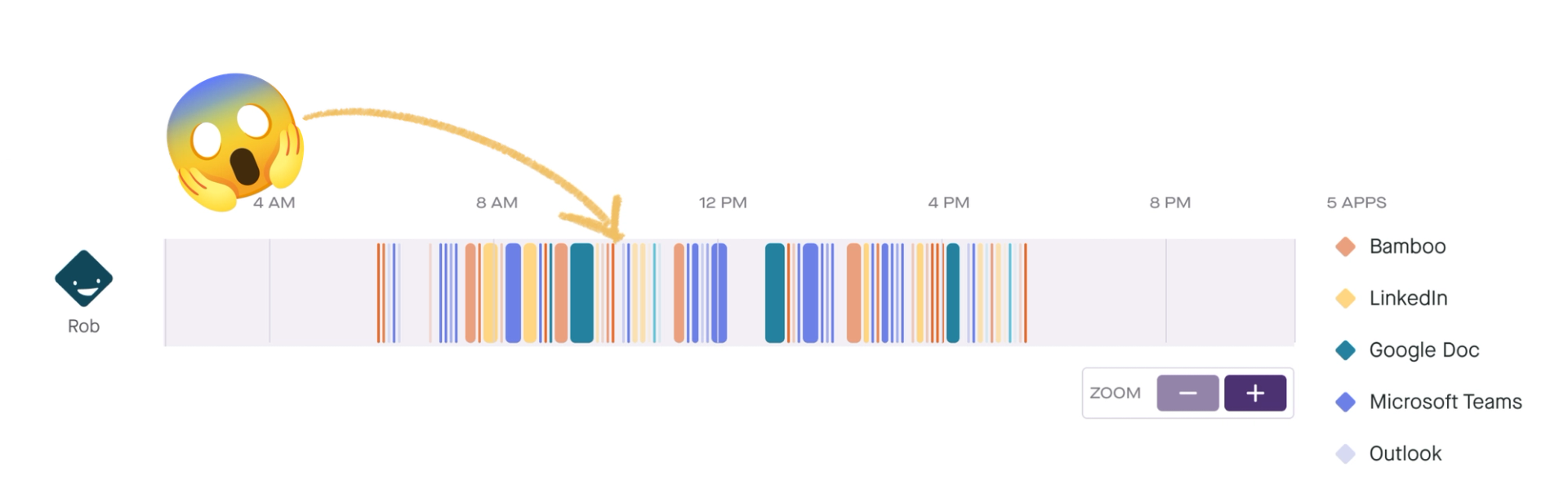 For example, we see Rob performing three different tasks with no structure. He’s using Bamboo and LinkedIn for recruiting, Google Docs to work on a blog post, and Teams and Outlook for collaboration.