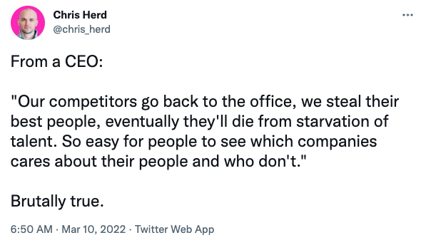 In my recent hiring, I’ve seen candidates come from companies that weren’t willing to change and accept more permanent flexible work options. But I’ve also seen candidates apply from companies that have completely sold their offices and have left their people without any option for in-office.