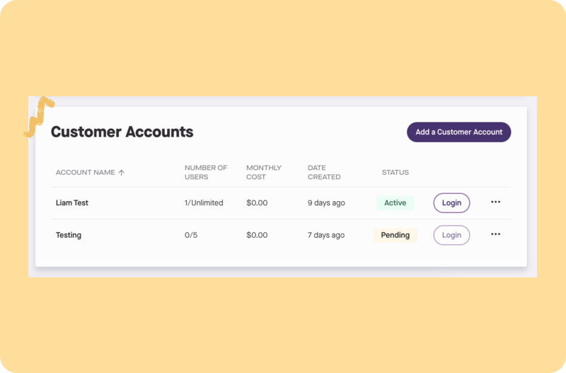 You can create and manage customer accounts and view account status from the detail panel. If given access by your customer accounts, you can log in to their accounts to manage using the login button.