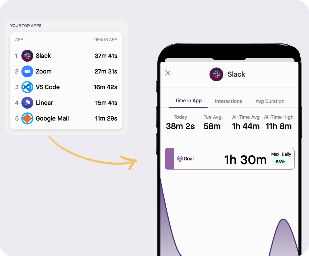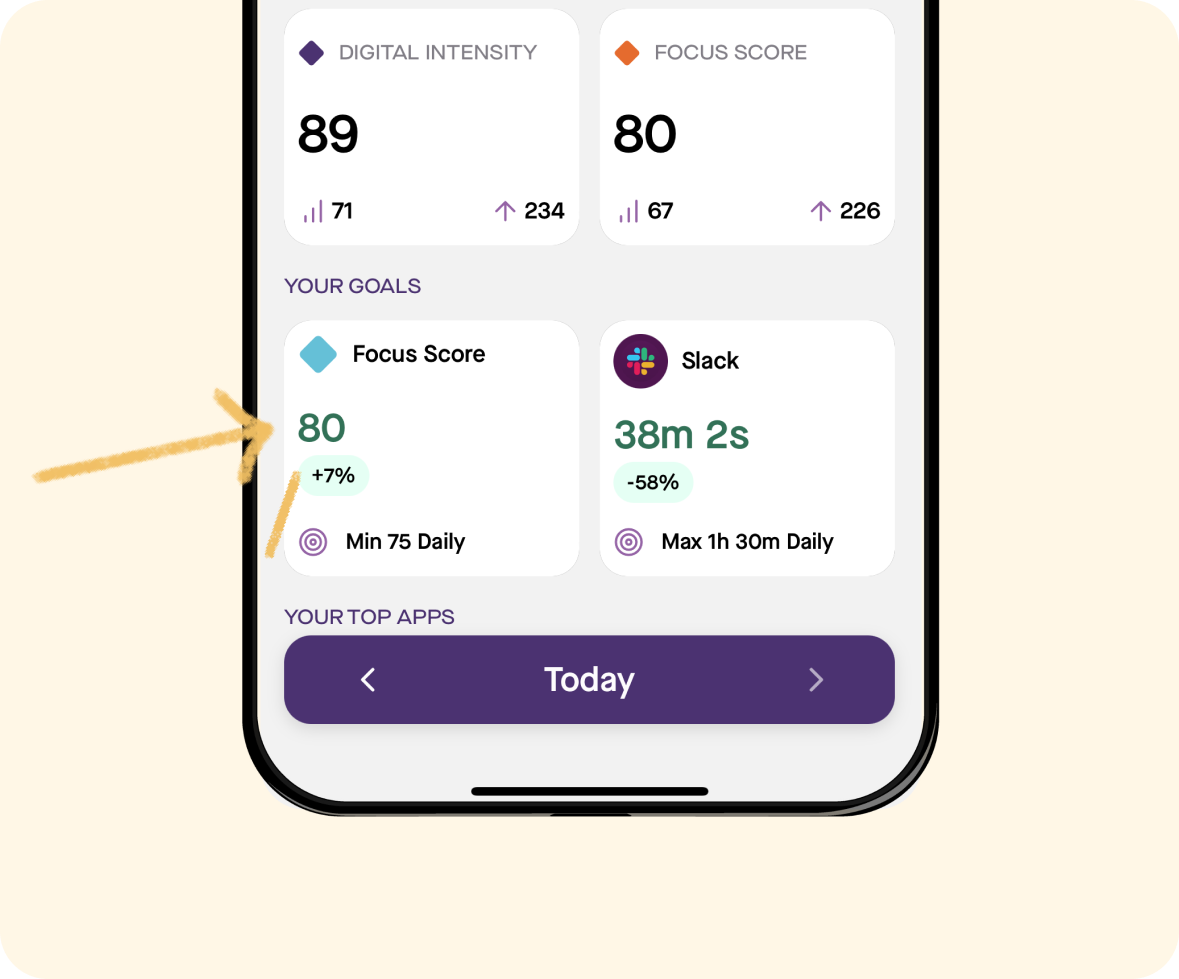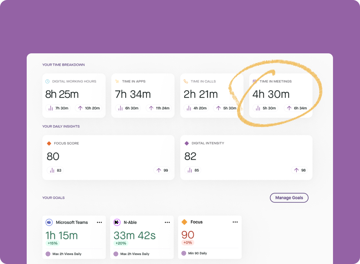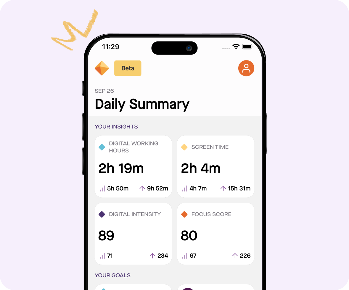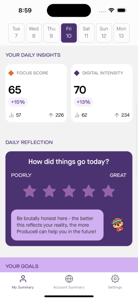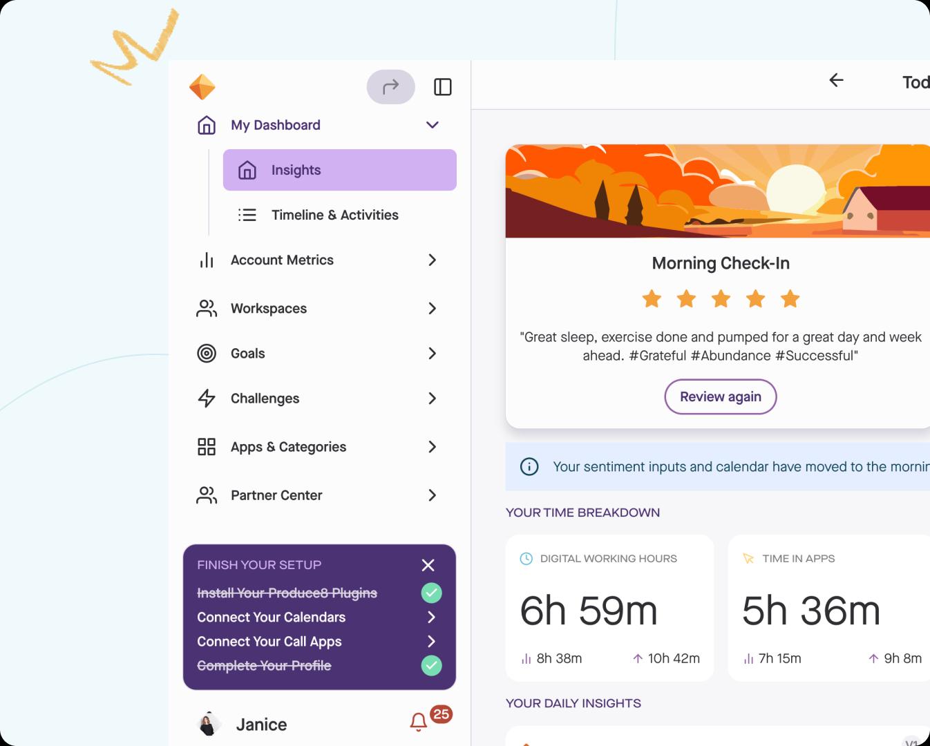 With Produce8 Goals, you can now set targets for your app usage and personal insight metrics. Whether it's 'screen time,' 'digital workday' length, or more, you're in control of your digital journey.