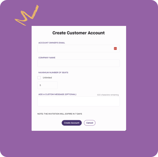 There is no need to wait for the customer to sign themselves up, you can create customer accounts right from your dashboard and then help them get set up. Enter the account owner (customer info) and allocate licenses from your pool to the account.