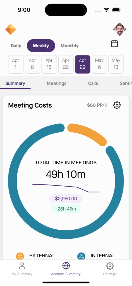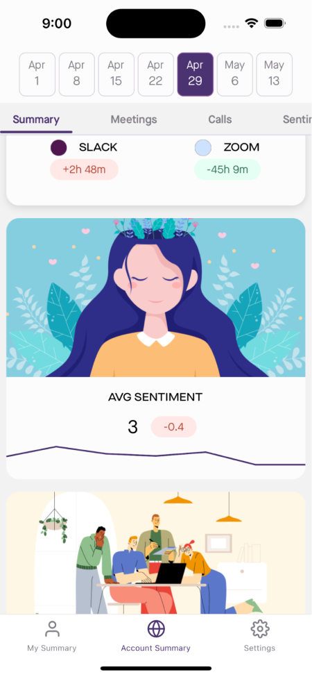 If you are an admin, an account owner, or have been granted the new report viewer privileges in Produce8 you can now view the account-level metrics from mobile. The summary dashboard is at your fingertips; you can keep tabs on company time spent in meetings, virtual calls, employee sentiment, and overworking risk.