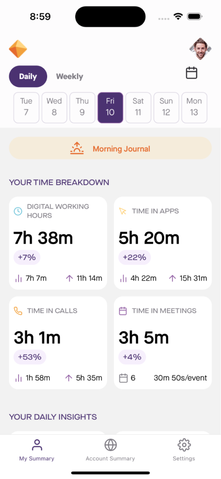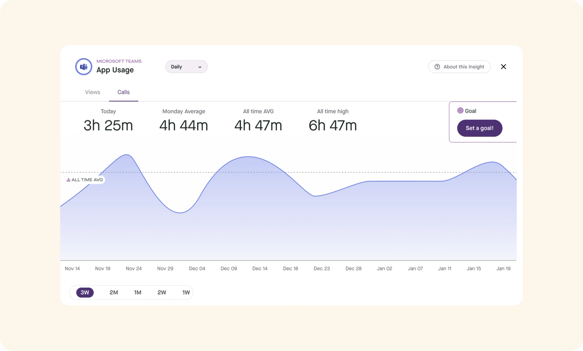 We've incorporated aggregated call data into “Your Daily Insights”, allowing you to see the amount of time you've spent in video calls, huddles, and virtual meetings throughout your day.