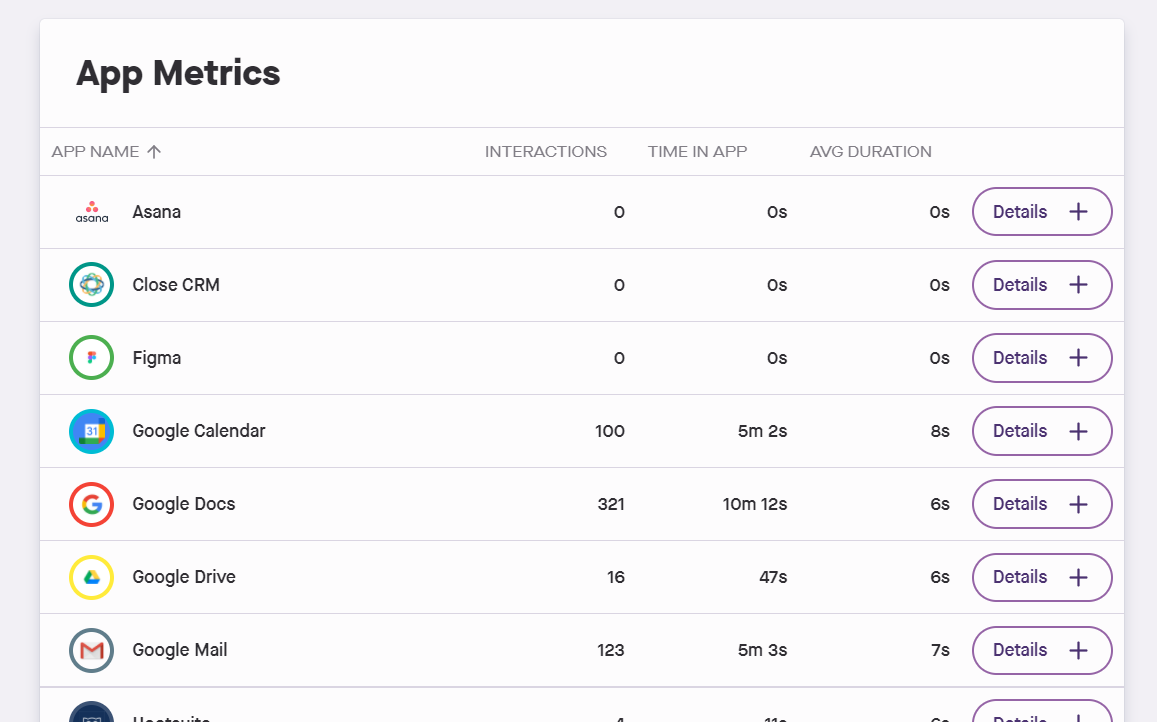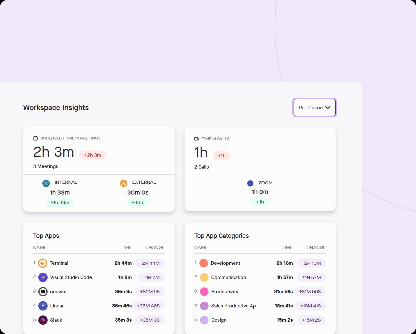 With this new feature, we couple your “App Views” (for example, actively looking at the Zoom window) and “Calls” (the actual time in a virtual call), allowing you to better understand how you spend your time and engage with your tools.