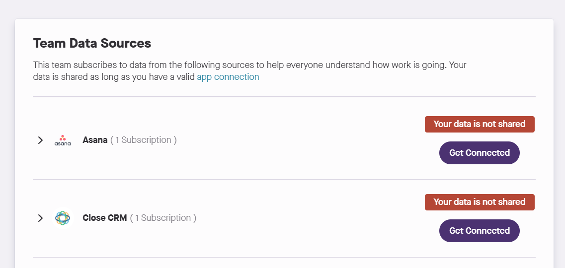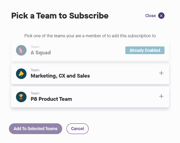 We now show all members of the team a list of the team's subscriptions. For each team member, we also identify whether or not they are connected to those.
