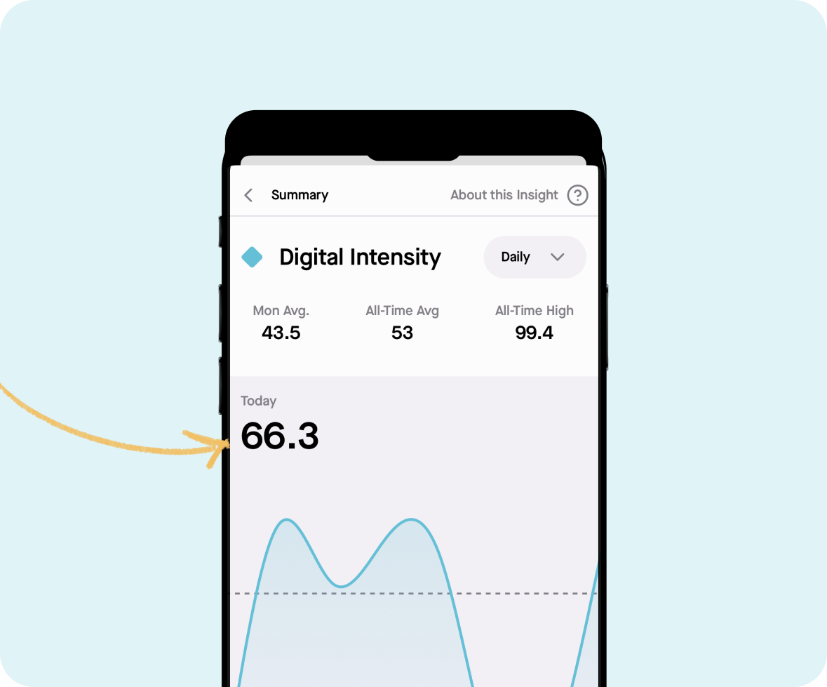 Personal insights for focus, digital intensity, working hours and screen time are the first features in view. You can click on any of them to see the time series history.