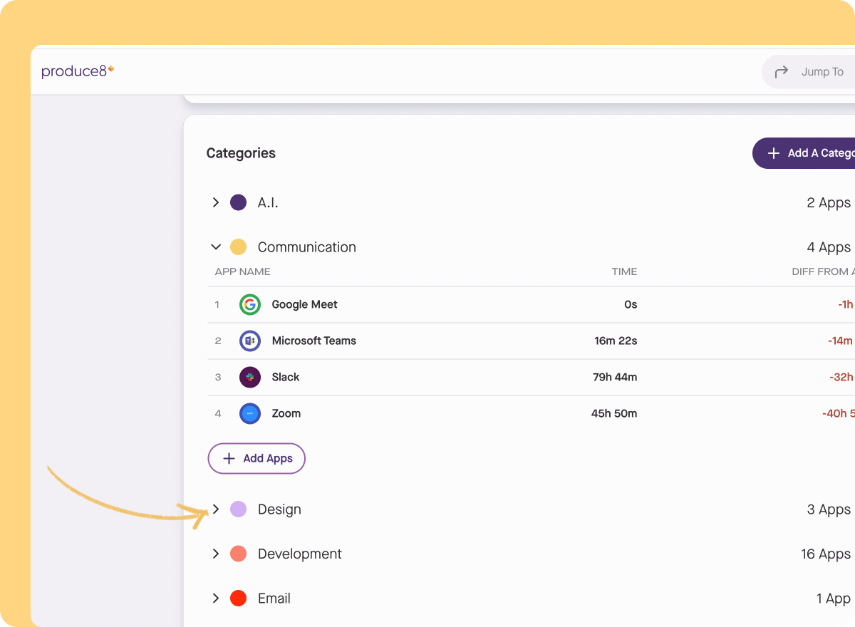 Produce8 helps you understand your work patterns by showing your interactions with the apps you use as you navigate your workday. But since individuals often use up to 40 different tools throughout a day, and several apps to complete a specific task, it can be hard to see how those interactions depict specific units of work or workflows. App Categorization lets users group interactions from multiple apps into a single task or subject.