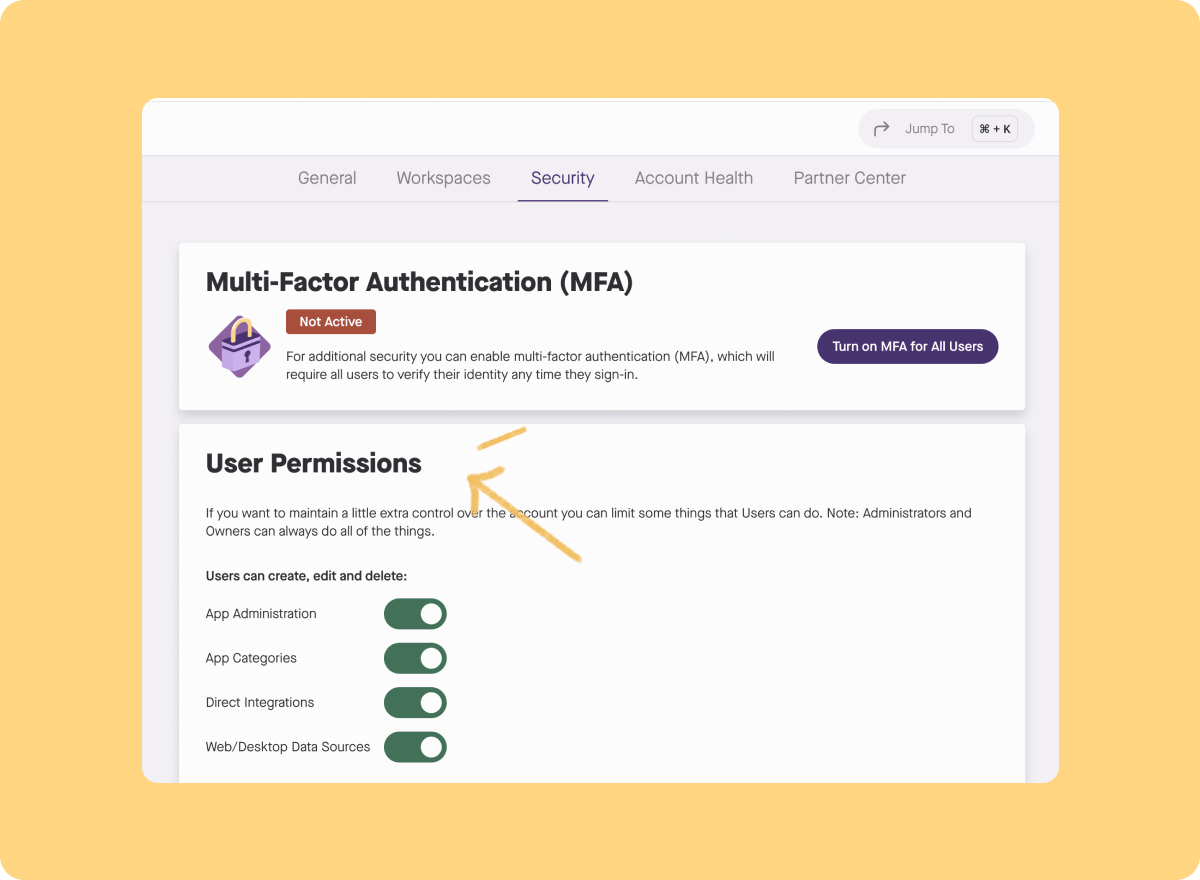By default, these User Permissions will be toggled off, limiting the management of Apps, Categories, and Integrations to Admins and Owners. This is to simplify the management and maintenance of data sources.