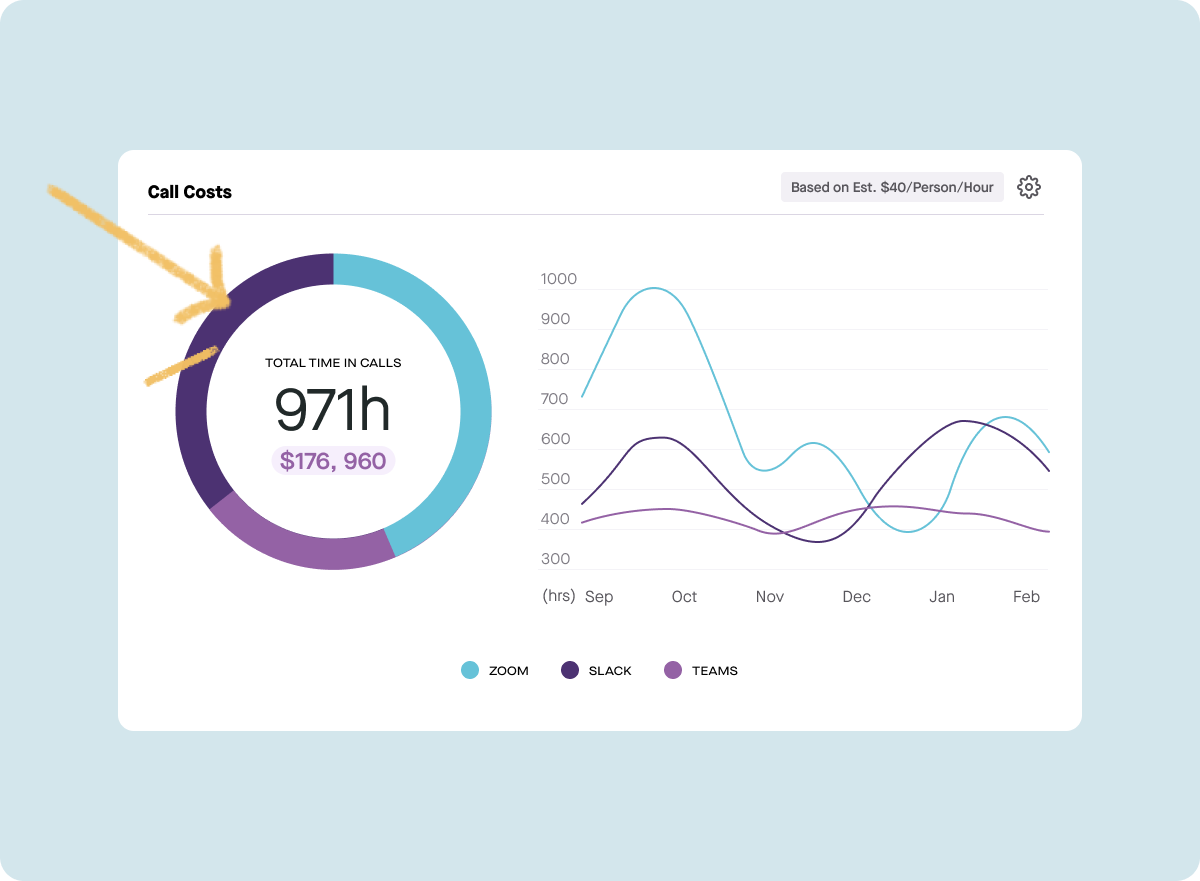 We can now show you the time you spend in calls, huddles, and virtual meetings across all of your collaboration apps including Microsoft Teams, Slack, and Zoom.